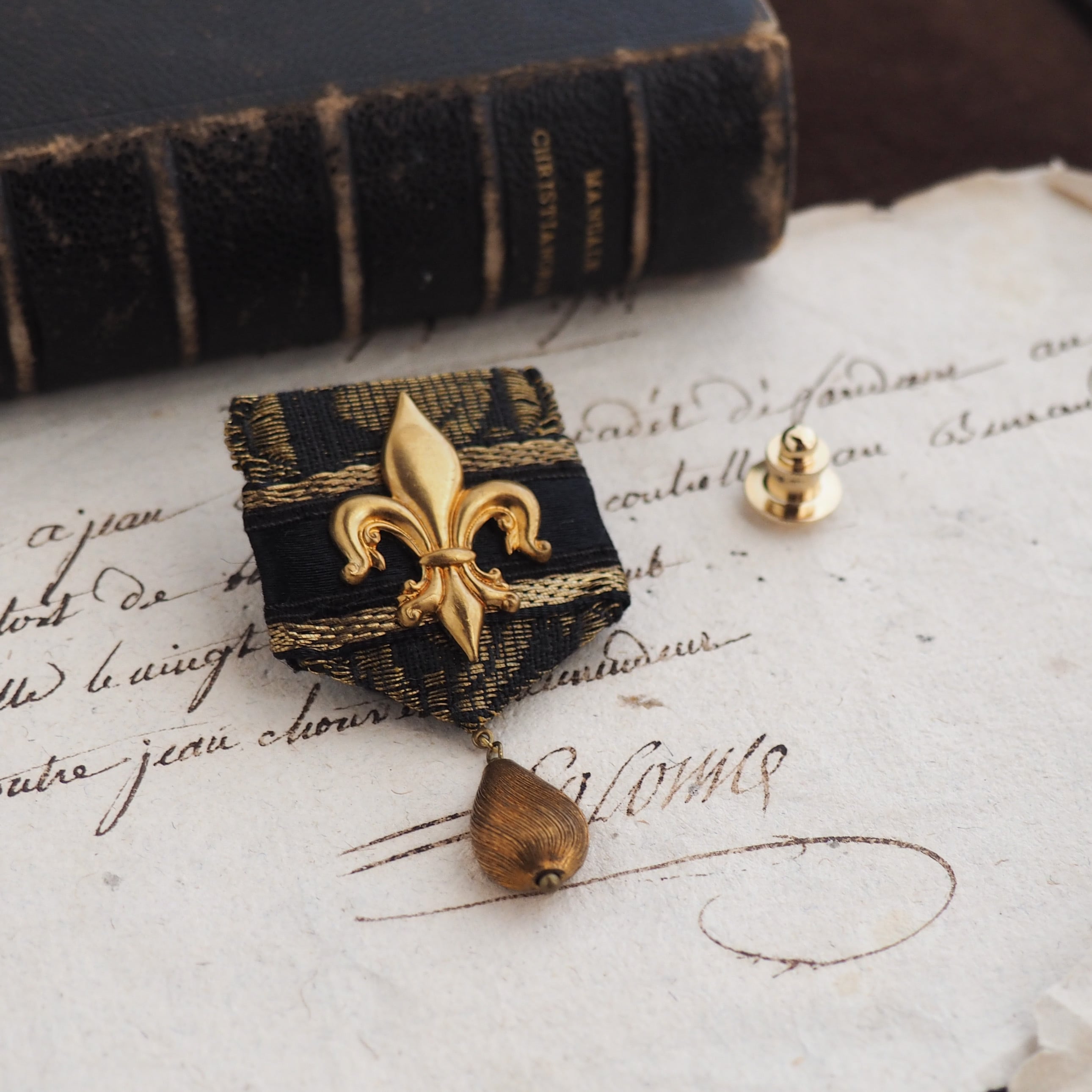 ヴィンテージのフルール・ド・リス(百合の紋章)を飾ったピンズタイプのピンブローチです。黒×ゴールドの豪奢なカラーリングのヴィンテージブレード2種類をベースにしていますが、ヴィンテージの落ち着いたゴールドなので渋さも感じる落ち着いた佇まいに仕上がりました。