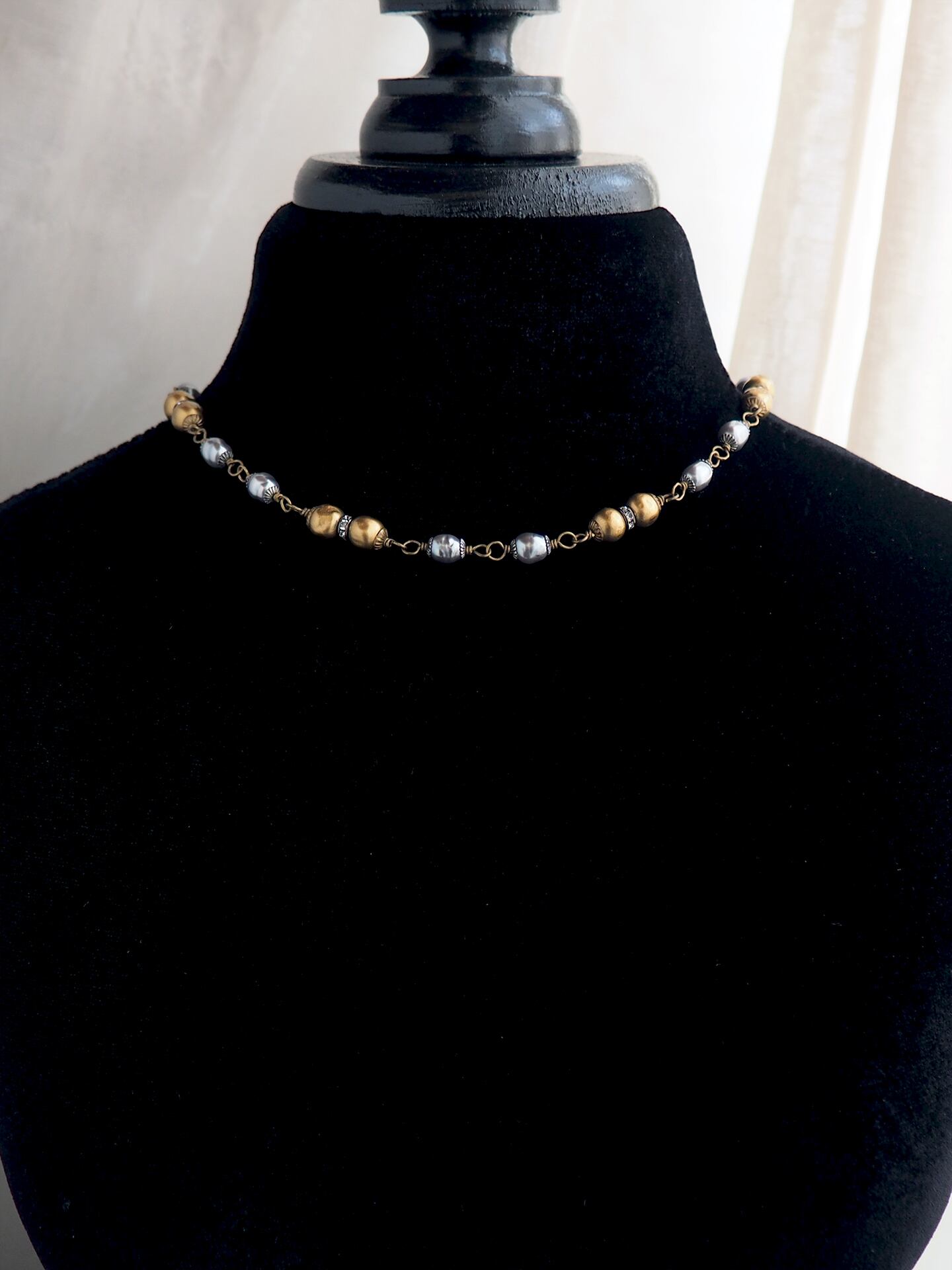 こちらはシルバーカラーとゴールドカラーのヴィンテージガラスパールを使ってコンビカラーで仕上げました。粒の大きさはゴールドの方がシルバーより少し大きめです。