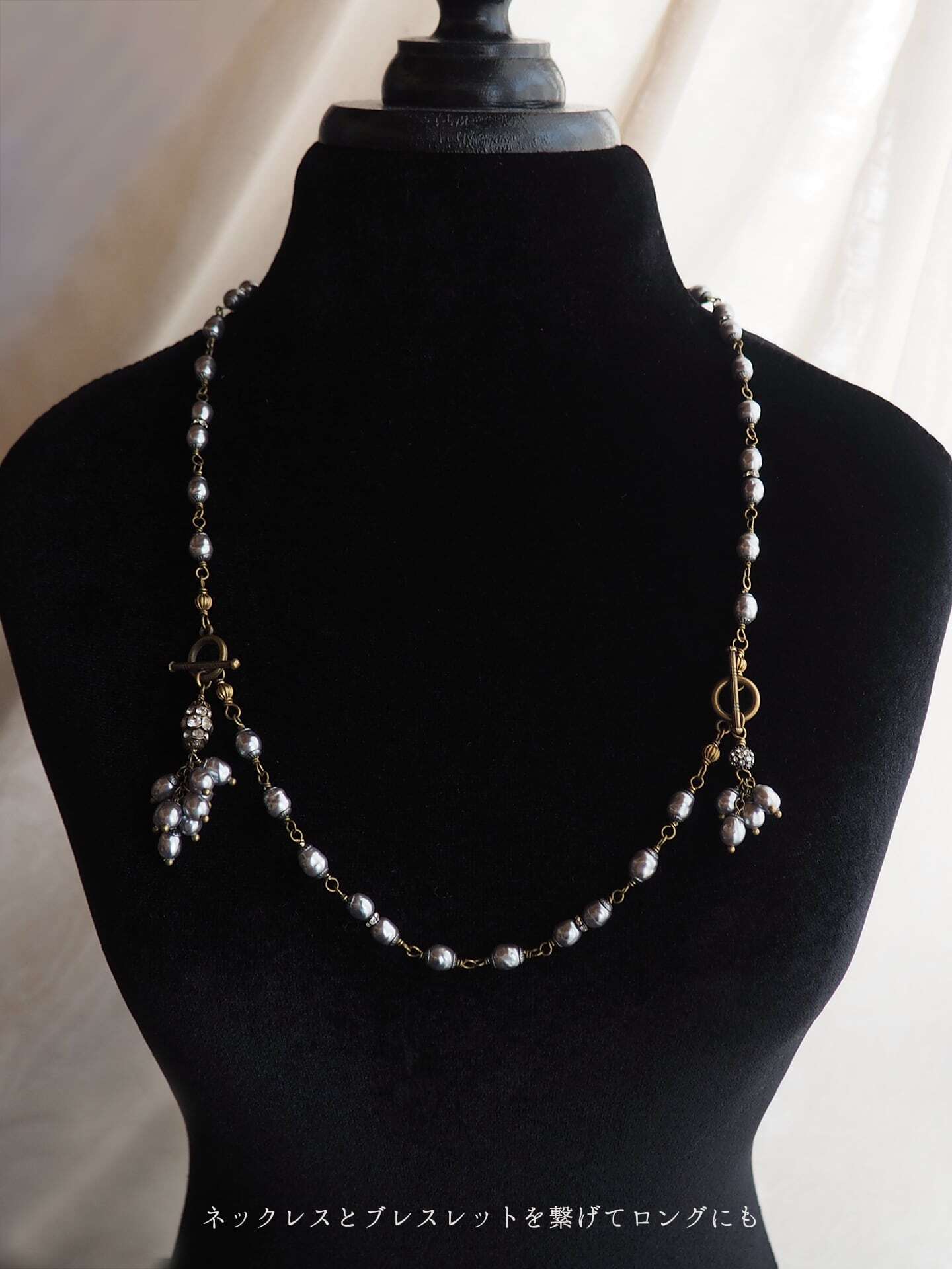 同じシリーズのブレスレットと繋げるとロングネックレスとしても活躍。この場合もどこを前に持ってくるかで様々なデザインが楽しめます。