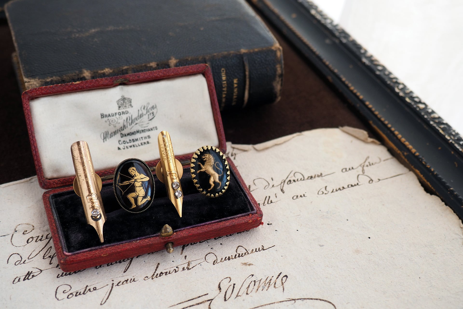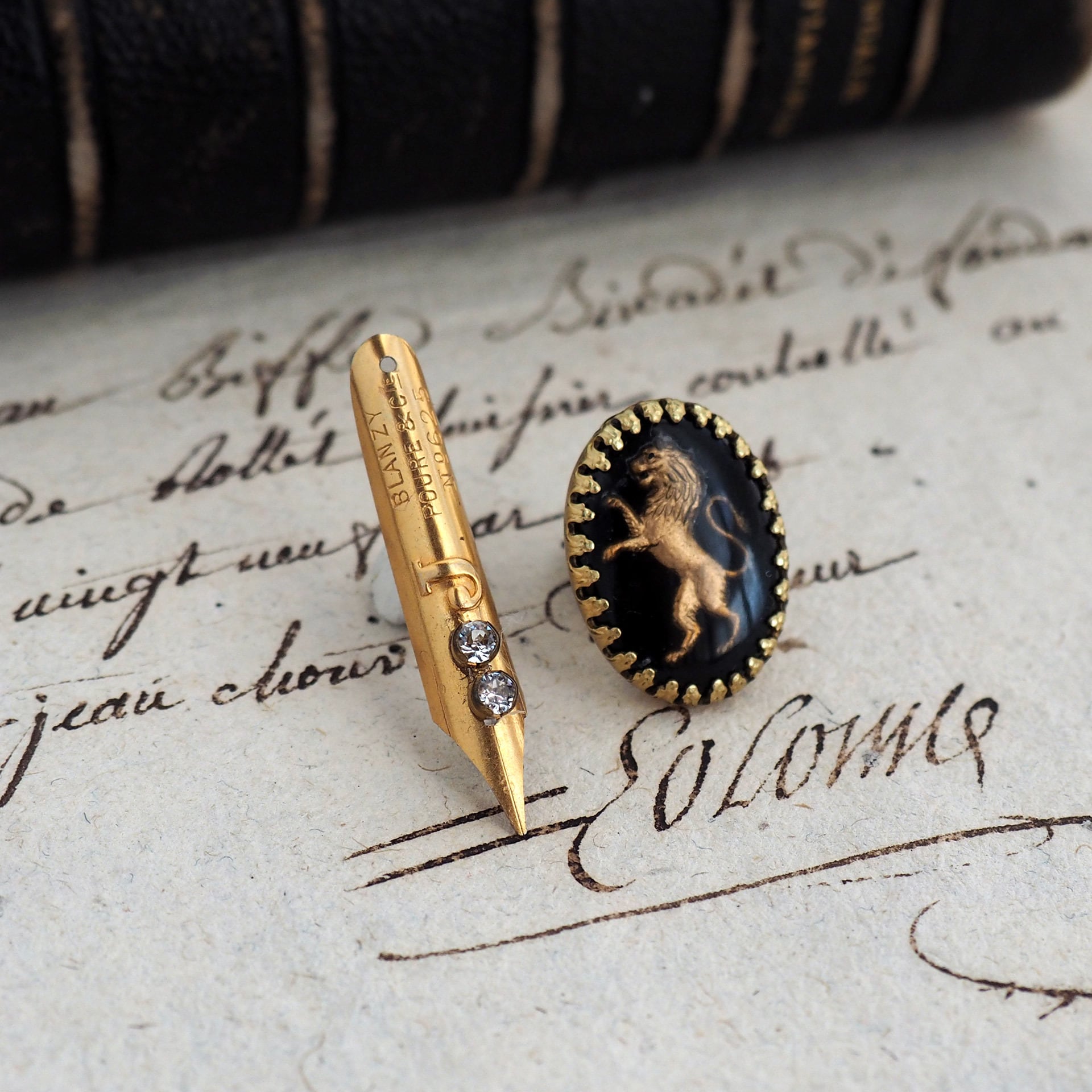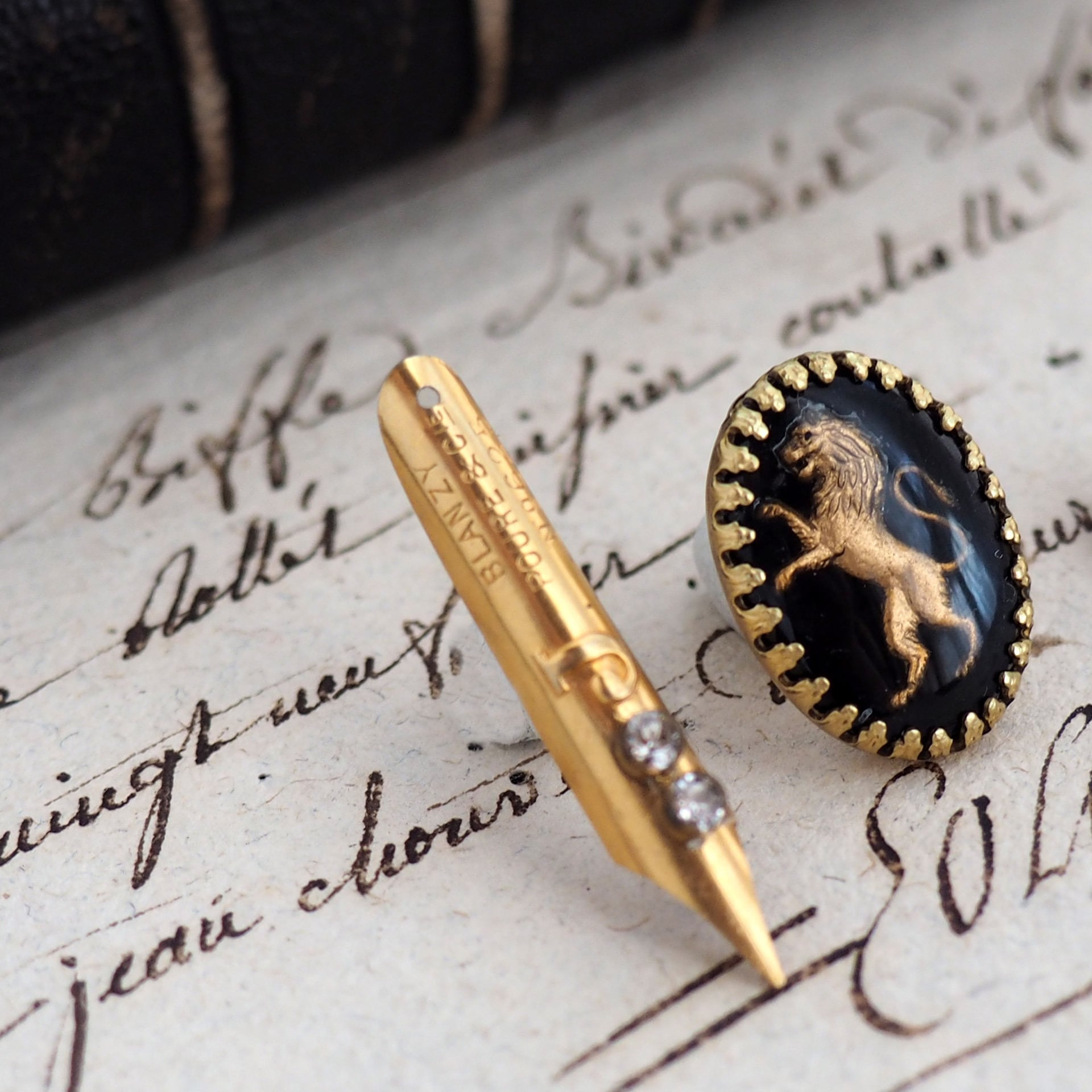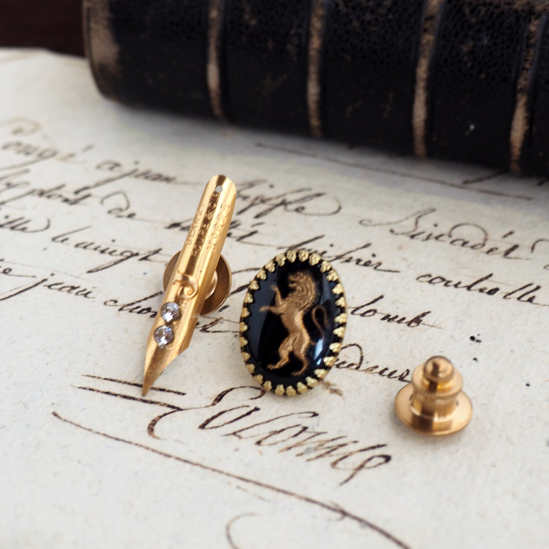こちらはペン先を剣、ヴィンテージカメオを盾として見立てた、「ペンと盾」という名の2個セットのアイテムです。